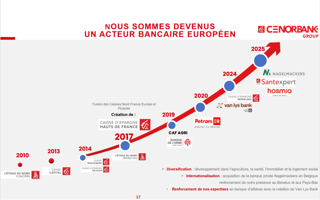La Caisse d’Épargne Hauts-de-France a décidé de regrouper ses différentes activités sous la marque institutionnelle CENORBANK l’ensemble de ses activités. Sa diversification se poursuit et s’assortit de résultats financiers qui atteignent un niveau historique. L’an dernier, elle a enregistré un produit net bancaire (PNB) de 865 millions d’euros, en hausse de 26 % par rapport à 2024, pour un résultat net de 206 millions d’euros (+ 29 % dont 7 % à l’international). La deuxième caisse du réseau après la Caisse d’ Épargne Ile-de-France s’approche donc du milliard d’euros de PNB (1,2 milliard d’euros pour CEIDF en 2024). Le groupe CENORBANK emploie 4 500 personnes et dispose d’un réseau de 300 agences ou centres d’affaires. Il compte 1 million de clients particuliers (+ 36 000 en 2025) ainsi que 44 000 clients professionnels et entreprises (+ 4 000 l’an dernier).